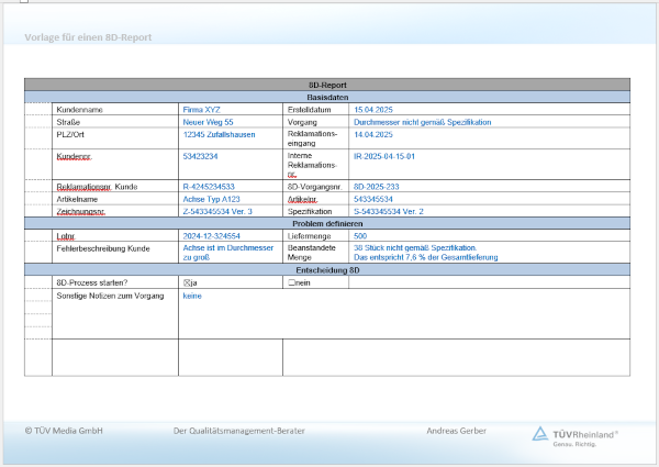 | • | Der 8D-Report ist das Dokument, das diesen Problemlösungsprozess schriftlich festhält. Er dient der internen Nachverfolgung und häufig auch der Kommunikation mit Kunden oder Lieferanten. |