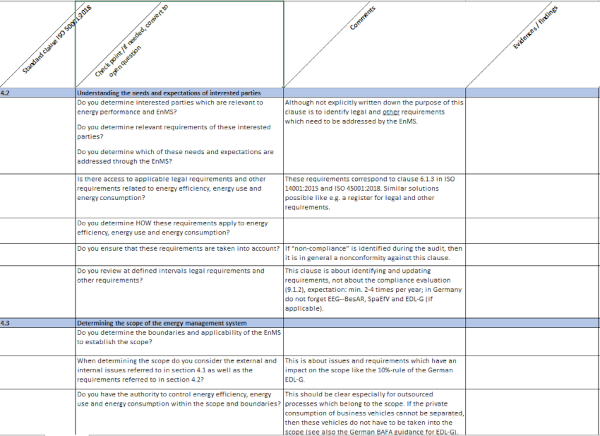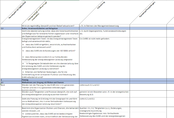 Dieser Beitrag liefert Ihnen eine umfangreiche Checkliste, mit der Sie ein Audit nach ISO 50001:2018 durchführen können. Entsprechende Auditplanung vorausgesetzt, können Sie die Liste sowohl im Audit als auch für die Berichterstattung einsetzen. Die farbliche Darstellung der Auditfeststellungen gibt Ihnen einen schnellen Überblick zu Stärken und Schwächen Ihres Systems.