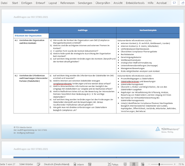 Zu Ihrer Zeitersparnis finden Sie einen direkt verwendbaren Auditfragenkatalog für das interne Systemaudit, basierend auf den Forderungen der ISO 37301:2021, beigefügt. Arbeitshilfen: von: |