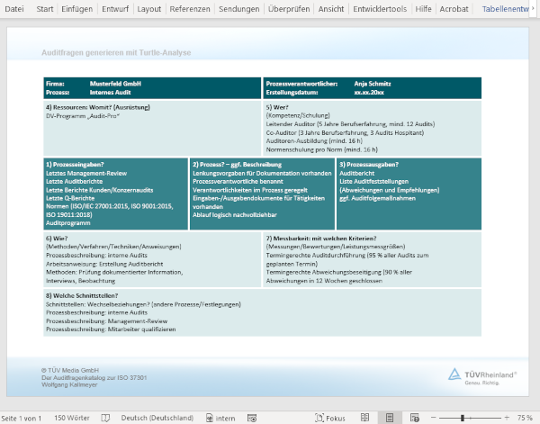 Im Kern des Beitrags erfahren Sie, wie Sie interne Audits nach dem internationalen Standard ISO 37301 „Compliance-Managementsysteme – Anforderungen mit Leitlinien zur Anwendung ” durchführen können. Zur Bildung von Auditfragen stellen wir Ihnen dazu die Textanalyse und die Turtle-Analyse vor, die beiden gebräuchlichen Methoden, mit denen Sie recht einfach passende Auditfragen generieren können.