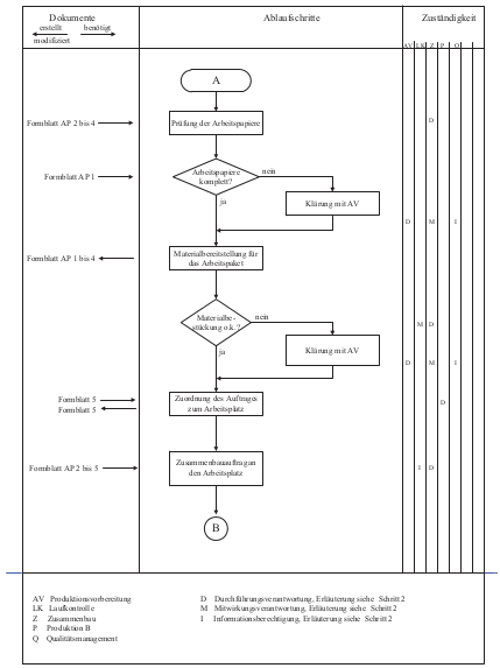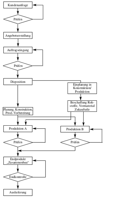 Mittels einer grafischen Darstellung der Abläufe in der Wertschöpfungskette im Unternehmen erleichtert man das Erkennen von Schnittstellen mit dem Übergang von Zuständigkeiten, ermittelt vorhandene Informationshilfen/Formulare und ggf. notwendige Prüfschritte. Ausgehend von einem Übersichtsdiagramm (s. Abb. 1) „Anfrage/Auslieferung” werden die Abläufe einzelner Abschnitte detailliert dargestellt (s. Abb. 2) und damit u. a. klare Zuständigkeiten zwischen mehreren Beteiligten eindeutig vereinbart.