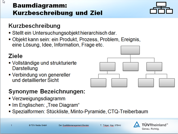 Das betrachtete Objekt kann dabei ganz unterschiedliche Dinge repräsentieren: Es kann sich bei ihm zum Beispiel um ein Produkt handeln, das in seine Baugruppen zerlegt werden soll. Diese wiederum sollen in Bauteile zerlegt werden. Ebenso kann ein Qualitätsproblem untersucht werden und in Haupt- bzw. auf nachfolgender Ebene in Nebenursachen zerlegt werden. Letztlich definiert der Anwender, was er mit dem Baumdiagramm analysieren möchte.