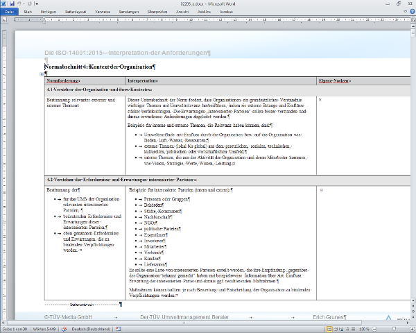 Dieser Beitrag richtet sich an Auditoren, Managementbeauftragte, Unternehmer und Berater sowie an alle, die am Aufbau und an der Pflege eines Umweltmanagementsystems nach ISO 14001 beteiligt sind. Er interpretiert und erläutert die Anforderungen der ISO 14001:2015. Ziel des Beitrags ist es, das Verständnis für die Normforderungen zu erhöhen und Anregungen für deren unmittelbare Umsetzung zu geben.