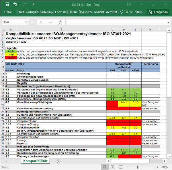 Ein direkter Vergleich der Forderungen der ISO 37301:2021 mit dem, was die anderen Normen des IMS (ISO 9001, 14001, 45001) bereits an Regelungen mitbringen, zeigt, dass in den meisten Fällen schon die Erfüllung der Forderungen dieser Normen ausreicht, um auch den Anforderungen der ISO 37301 zu genügen (s. Kompatibilitätsmatrix, grüne Felder). Ein kleinerer Teil erfüllt die Forderungen nur zum Teil, d. h., die bestehenden Regelungen im IMS müssen hinsichtlich der ISO 37301 ergänzt werden (s. Kompatibilitätsmatrix, gelbe Felder). Es gibt aber auch einen restlichen Teil an Forderungen in der ISO 37301, die keinen oder nur mangelhaften Bezug zu Regelungen in den anderen Normen im IMS haben. Diese Kapitel müssen mit systemspezifischen Regelungen zum CMS neu erstellt werden (s. Kompatibilitätsmatrix, rote Felder).