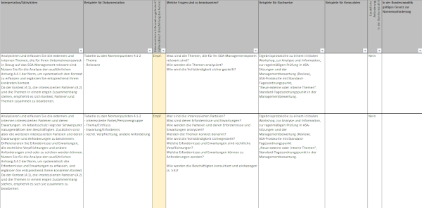 Die Norm verlangt an einigen Stellen dokumentierte Informationen. In der Tabelle in der Arbeitshilfe finden Sie Hinweise auf Dokumentationsbeispiele, die nicht im Detail ausgearbeitet sind. Greifen Sie an diesen Stellen, wenn vorhanden, auf das zurück, was Sie bereits im Einsatz haben. Falls es zu einem Thema bei Ihnen noch ein weißes Blatt gibt, können Sie sich anhand der zu diesen Themen gestellten Fragen den Inhalt einer Dokumentation konkret erstellen.