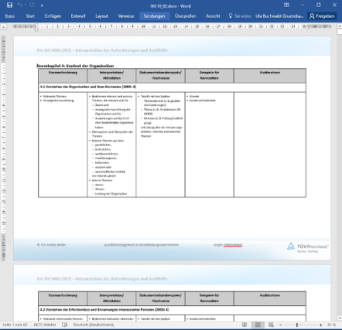 In der beigefügten Arbeitshilfe sind die Anforderungen der Norm in Tabellenform stichwortartig aufgelistet und praxisorientiert interpretiert. Mit Hinweisen zur Umsetzung wird dem Leser veranschaulicht, in welcher Form die Anforderungen erfüllt werden können. Diese Beispiele sind auch dazu geeignet, den Nachweis der Umsetzung zu dokumentieren. Die dort ebenfalls angeführt Kennzahlenbeispiele spiegeln die Möglichkeiten wider, um die ständige Verbesserung zu steuern und die Ergebnisse in allen Bereichen nachweisbar für interessierte Parteien und die Mitarbeiter zu machen. Sie können die Tabelle auch als Arbeitsgrundlage z. B. im Rahmen der Vorbereitung oder der Durchführung interner Audits nutzen. Arbeitshilfen: von: |