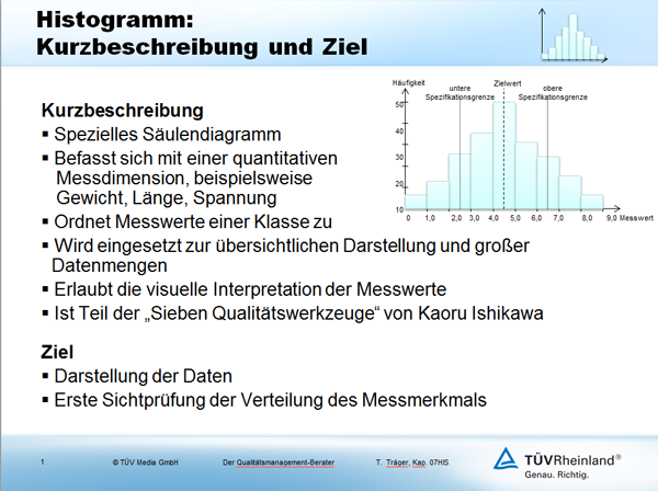 Das Histogramm dient zur übersichtlichen Darstellung der Verteilung einer größeren Menge von Messwerten. Es ist Teil der sieben grundlegenden Qualitätswerkzeuge (Q7) des Japaners Kaoru Ishikawa und wird dort zur Fehlererfassung eingesetzt.