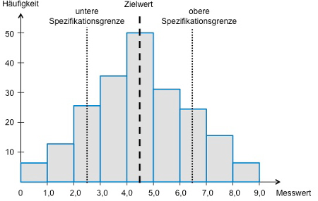 Das Histogramm ist ein Säulendiagramm, das die Daten einer quantitativen Messdimension in Klassen zusammenfasst und darstellt. Es konzentriert sich auf eine quantitative Messdimension. Beispiele sind die Länge oder das Gewicht eines Produkts, die Spannung eines Schaltkreises oder die Zeitdauer bis zur Beantwortung einer Kundenanfrage. Attributive Daten können nicht mit dem Histogramm ausgewertet werden.