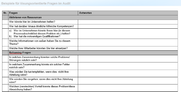 Unsere Audits sind häufig geprägt von einem hohen Maß an Routine. Dies birgt jedoch die Gefahr, Potenziale brach liegen zu lassen, indem Audits die immer gleichen Ziele verfolgen und die immer gleichen Fragen verwenden. Dieser Beitrag zeigt die Wichtigkeit und vor allen Dingen die Möglichkeit auf, „frischen Wind” in die internen und externen Audits zu bringen. Basierend auf Erkenntnissen der lösungsorientierten Beratung geht es um andere Sichtweisen und vor allen Dingen um „die etwas andere Auditfrage”. Darüber hinaus soll eine Beispielliste Impulse für den Einsatz dieser Fragen im eigenen Betrieb geben. Arbeitshilfen: von: |