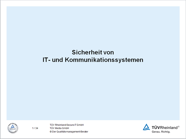 Als Arbeitshilfe finden Sie die Präsentation „Sicherheit von IT- und Kommunikationssystemen”. Sie lässt sich beliebig an die jeweiligen eigenen Bedürfnisse anpassen.[