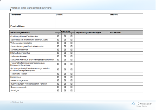 Die DIN EN ISO 9001:2015 fordert, dass die oberste Leitung das Qualitätsmanagementsystem in geplanten Abständen zu bewerten hat, um dessen fortlaufende Eignung, Angemessenheit und Wirksamkeit sowie dessen Angleichung an die strategische Ausrichtung des Unternehmens sicherzustellen [1]. In der Managementbewertung sind mindestens folgende Aspekte zu bewerten: