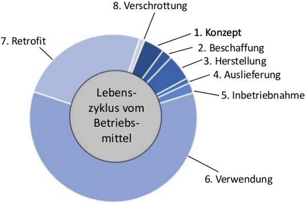 Im Allgemeinen (s. Abb. 1) ist der Zeitraum der Verwendung (6) eines Betriebsmittels am größten. Im Lebenszyklus eines Betriebsmittels ist von der Konzeptionierung (1) bis zur Inbetriebnahme (5) ein kurzer Zeitraum angesetzt. Dies ist abhängig von Größe, Art und Einsatzgebiet. Im Bereich der Verwendung (6) liegen erhebliche Potenziale für die Kosteneinsparungen verborgen. Hier ist ein besonderer Fokus auf PdM im Zusammenhang mit Retrofit (7) zu legen. Damit können Sie die Nutzungsdauer verlängern. Vor allem die Einführung von PdM und die damit verbundene Digitalisierung schont die knapp gewordenen Ressourcen. Durch den digitalen Wandel stehen Technologien der PdM zur Verfügung, die den Unternehmen noch nie dagewesene Chancen ermöglichen, wie im Bereich der:
