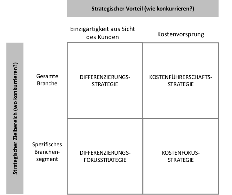 Ein Unternehmen wird nur dann seine Wettbewerbsposition halten oder ausbauen können, wenn sein Geschäft eindeutig strategisch ausgerichtet ist. Eine Strategie zeigt die grundsätzliche Verhaltensausrichtung für einzelne Produkt-Markt-Bereiche. Ein Wettbewerbsvorteil entsteht durch ein Alleinstellungsmerkmal (Unique Selling Proposition „USP”), also dadurch, dass das Unternehmen Produkte anbietet, mit denen es eine Überlegenheit im Hinblick auf wichtige vom Kunden wahrgenommene Eigenschaften erzielt, die von Wettbewerbern zumindest kurzfristig nicht einholbar sind. Dies können niedrige Kosten und Preise, besondere Qualitäts- und Leistungsmerkmale oder aber Zeitvorteile sein. Auf der Grundlage dieser Erkenntnis lassen sich folgende Wettbewerbsstrategien, die auch in Abbildung 1 gezeigt werden, im Hinblick auf ihren strategischen Vorteil und Zielbereich unterscheiden: