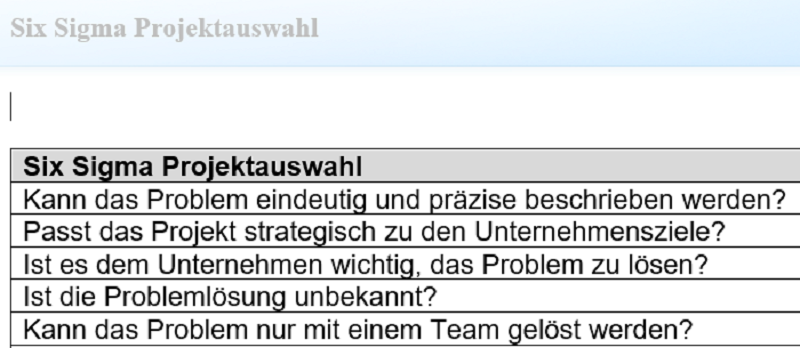 Im Gegensatz zu anderen Verbesserungsmethoden ist bei Six Sigma die Lösung unbekannt. Die Projektauswahl kann zum Beispiel in einer Vor-Definitionsphase durch einen Six-Sigma-Lenkungsausschuss getroffen werden (s. Abb. 1). Themen für Six-Sigma-Projekte sind z. B.: