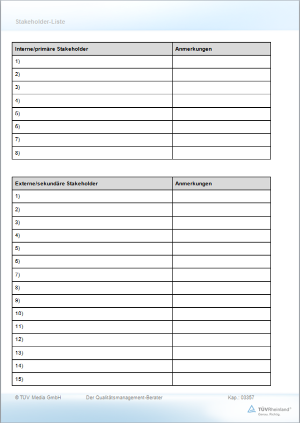 | • | Ist bekannt, welche Personen, Gruppen, Organisationen und Institutionen ein Interesse an den Aktivitäten des Unternehmens haben? |