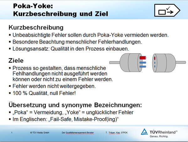 Poka-Yoke ist ein Konzept zur praktischen Umsetzung einer Null-Fehler-Strategie. Poka-Yoke setzt im Prozess an und zielt mit seinen Elementen auf die Fehlervermeidung, da so die Ursache von Qualitätsmängeln beseitigt wird. Wo eine Fehlervermeidung nicht möglich ist, wird die unmittelbare Fehlererkennung und -beseitigung angestrebt.