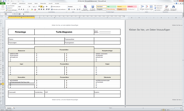 | 2. | Die sechs Bereiche werden in der Reihenfolge Output, Input, Ressourcen, Kompetenzträger, Dokumente, Kennzahlen nacheinander detailliert betrachtet und die Ergebnisse in das Diagramm übertragen („Kopf”, „Schwanz” und „Extremitäten” der Schildkröte). |
