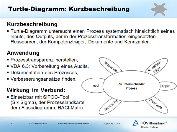 Das Turtle-Diagramm untersucht diesen Transformationsprozess genauer. Neben Input und Output werden Ressourcen, Kompetenzträger (prozessbeteiligte Personen und ihre Fähigkeiten), Dokumente und Kennzahlen betrachtet. Optisch lassen sich diese sechs Bereiche in der Form einer Schildkröte anordnen.