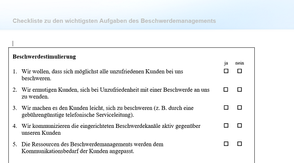 Dieser Beitrag beschreibt die Ziele, die mit einem aktiven Beschwerdemanagement erreicht werden können, und die Einzelaufgaben, die zur Zielerreichung erfüllt werden müssen. Arbeitshilfen: von: |