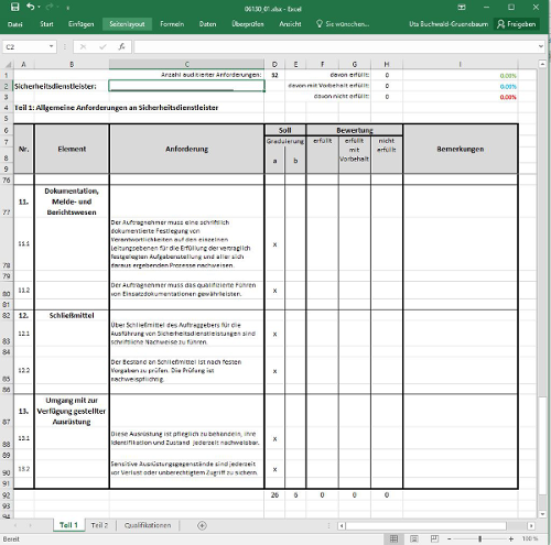 Mit der beigefügten Mustercheckliste soll der Qualitätsmanager ein Instrument an die Hand bekommen, das ihn in die Lage versetzt, auch auf dem speziellen Gebiet der Sicherheit seine Einflussnahme auf die Umsetzung der Forderung der ISO 9001 nach Überprüfung der Dienstleistung und des Dienstleisters sowie der Pflicht zur Dokumentierung der „Ergebnisse von Beurteilungen” wirksamer zu gestalten.
