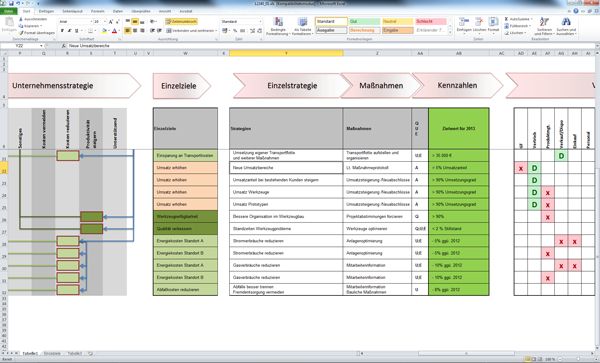 In diesem Beitrag wird Ihnen eine Vorgehensweise vorgestellt, wie Sie – ausgehend von einer langfristigen Vision – in 10 Schritten Ihre Unternehmensziele nachhaltig in die Praxis umsetzen können. Zur Realisierung dieser Vorgehensweise, die sich in zahlreichen Projekten bewährt hat, wird ein einfach zu handhabendes Werkzeug auf Excel-Basis eingesetzt, das die einzelnen Schritte wirkungsvoll unterstützt und dokumentiert. Die Anwendung dieser Vorgehensweise im Rahmen eines Integrierten Managementsystems kann dessen Wirksamkeit entscheidend verbessern und eignet sich insbesondere für kleine und mittlere Unternehmen.